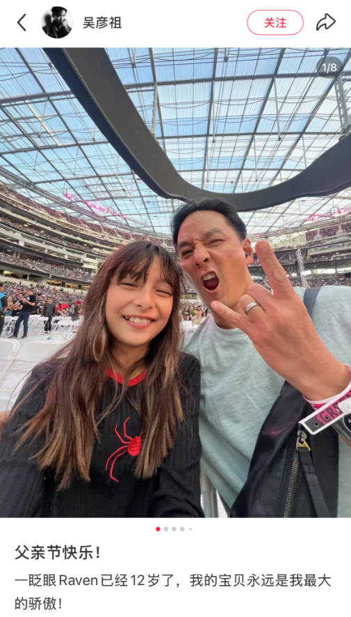 2025年6月16日,吴彦祖还曾在社交平台晒出与女儿的多张合照,并配文:“一眨眼Raven已经12岁了,我的宝贝永远是我最大的骄傲!”